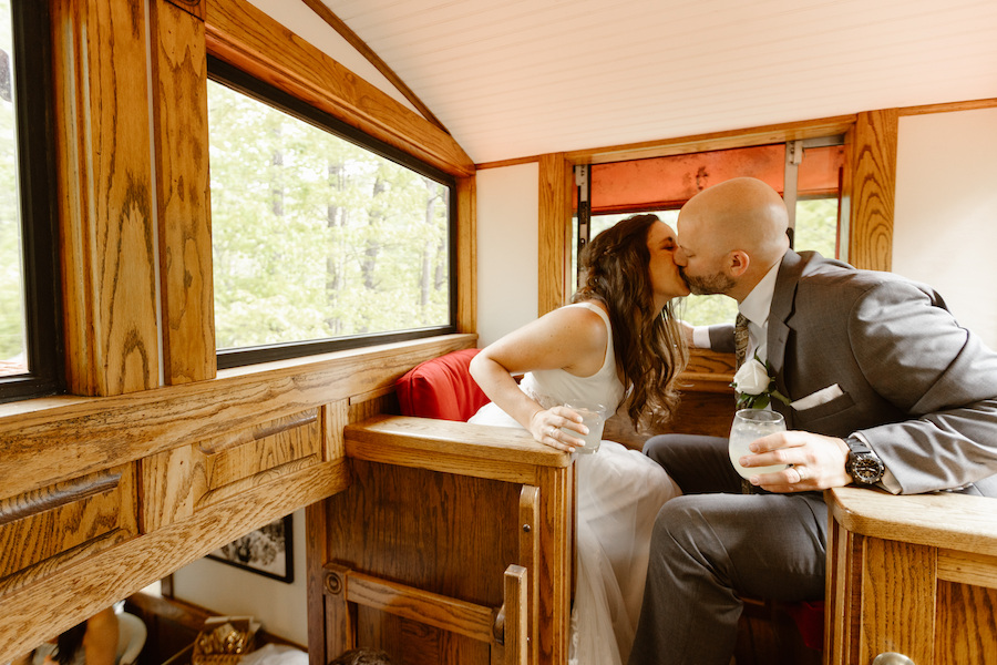 The Great Smoky Mountain Railroad elopement package includes train tickets for you and your guests, a luxurious private rail car, ceremony planning and officiation, three hours of professional photography, and coordination every step of the way.